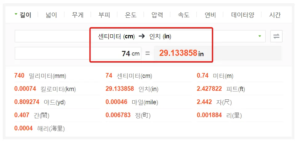 - 74cm x 0.3937 = 약 29.1인치