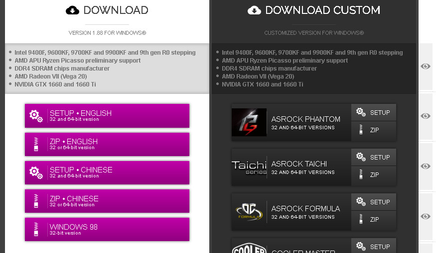 그럼 화면 왼쪽 편으로 총 5개의 핑크색 CPU-z 다운로드 버튼을 찾을 수 있습니다. 일단 가장 크게 눈에 띄는 것은 english라는 단어와 CHINESE, windows98인데요. 아직 윈도우98을 이용하신다면 서둘러 업그레이드 부터 진행하시는 것이 좋습니다. 적어도 필자는 중국어보다는 영문이 그나마 나을것 같더군요.