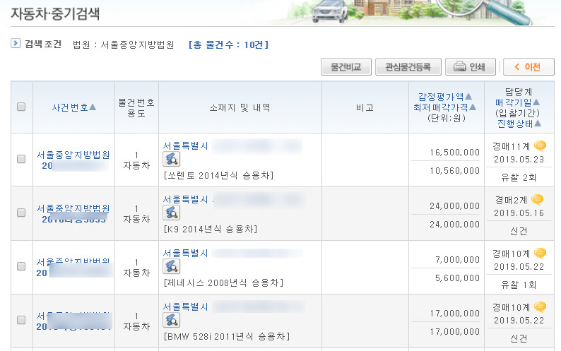 아파트와 오피스텔같은 건물말고도 가장많이 압류되는 물건으로 자동차가 있는데요. 연식과 감정가액 유찰 등 다른 물품들과 같이 경매정보를 확인해볼 수 있습니다.