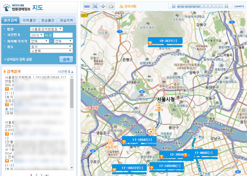 이번에는 지도를 통해 대법원 경매정보에 올라온 물건들을 살펴보는 방법입니다. 자신의 지역에서 얼마나 올라오고 있는지 어느 지역의 경매물건들이 많은지 한눈에 확인할 수 있습니다. 사건번호와 주소등을 빠르게 확인할 수 있어 도움이 될것으로 보여집니다.