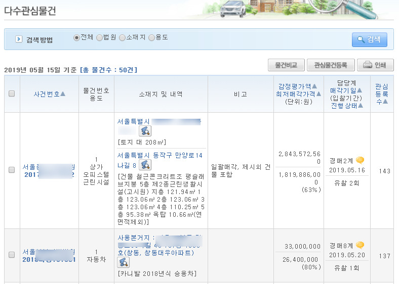 이번에는 관심등록수를 통한 50위까지의 순위입니다. 대법원 경매정보에 가입한 회원들이 관심등록을 하게되면 그만큼 인기상품으로 눈길을 끌게되는데요. 많은 사람들의 관심을 받은 물건이 어떤것인지 알아보고 시작해보는 것도 좋습니다. 하지만 최근에는 여러가지방식으로 관심을 끌려는 분들이 많기때문에 꼭 좋은 물건이라고 볼 수는 없으니 주의하셔야 합니다.