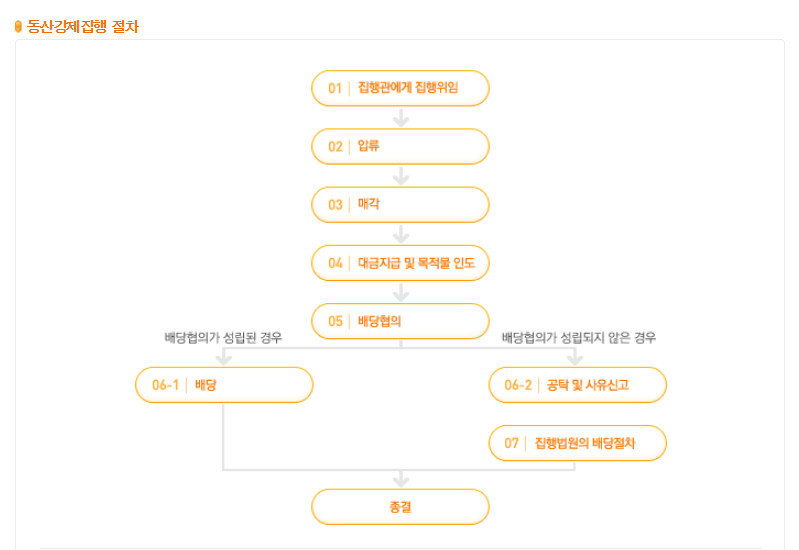 동산의 경우에도 집행관의 위임을 통해 압류를 시작한 다음 경매를 통해 매각한 다음 대금지급 및 목적물 인도를 하게됩니다. 이후 배당협의를 하고 종결에 이르게 됩니다. 보통은 이런 순서로 진행이 되지만 재테크를 하시는 분들은 물건을 더 꼼꼼히 보고 가격을 잘 따져보는 것이 제일중요합니다.