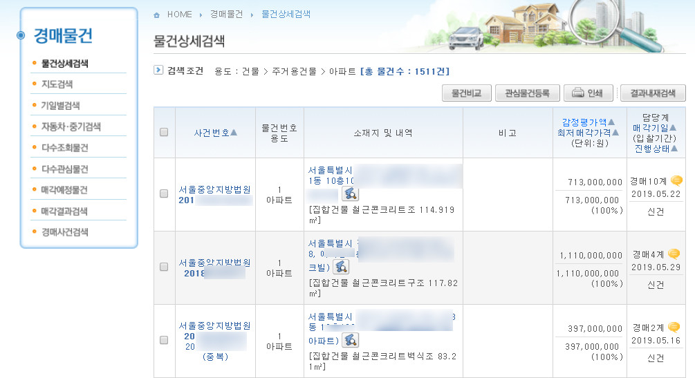 제일 기본적으로 안내되고 있는 대법원의 경매정보 홈페이지에서 아파트를 살펴보겠습니다. 제일 많이 나오는 물건들은 역시나 아파트, 빌라, 오피스텔과 같은 주거시설과 승용차, 임야, 전답 등입니다. 아파트를 보시면 사건번호와 소재지 감정가액 매각 기일등이 안내되어 있습니다.
