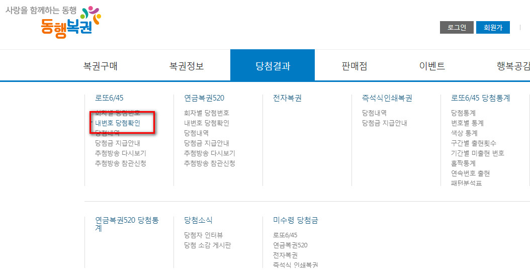여러분이 로또를 조금만 사셨다면 하나씩 확인하는데 별로 시간이 걸리지 않습니다. 하지만 최대 10만원까지 살 수 있는 방식이다 보니 많아질수록 시간이 걸리고 귀찮아질수 있습니다. 이경우에는 홈페이지에서 내번호 당첨확인을 통해 쉽게 조회해 볼 수 있습니다.