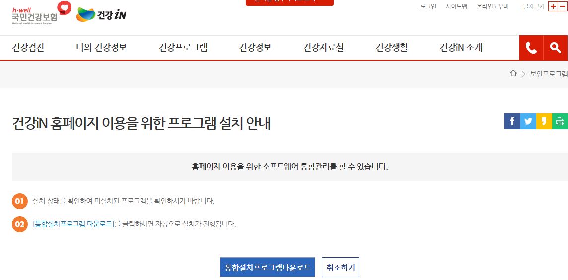 공인인증을 진행하는 만큼 국민건강보험 건강in 홈페이지의 이용은 보안프로그램이 필수적으로 설치가 진행이 되어야 합니다. 인터넷뱅킹을 하는 것과 비슷한 원리네요.