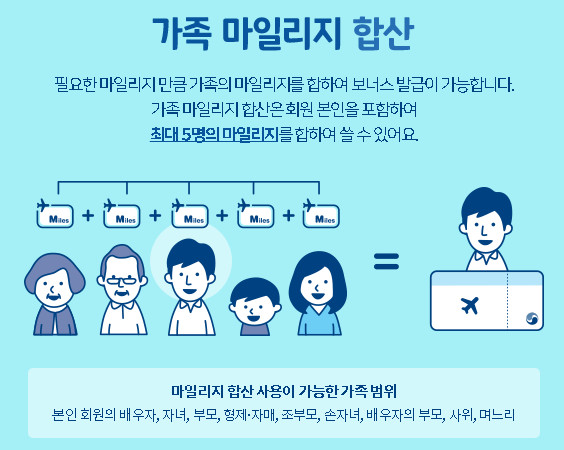대한항공 마일리지 사용방법은 이 처럼 다양한 사용처로써 이용이 가능한데요. 그리고 가족 합산을 통해서 최대 5명이 합해서 사용할 수 있는 방법도 있었습니다. 많은 분들이 이런 방식으로 많은 분들이 혜택을 받고 계시다고 하네요.