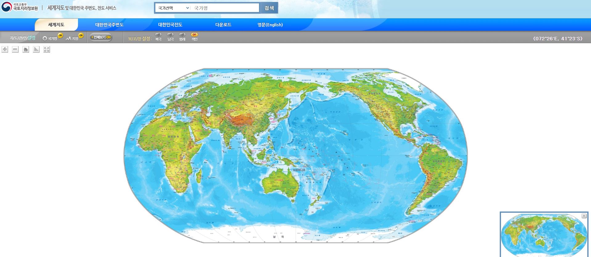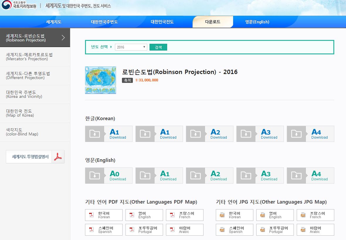 기본적으로 국토지리정보원 홈페이지에서 세계/대한민국주변도 페이지로 가시면 세계지도보기가 가능하구요. 여기에서 다운로드탭으로 이동하시면 로빈슨도법, 메르카토르도법 등을 통한 한국어, 영문 세계지도를 받으실 수 있습니다.
