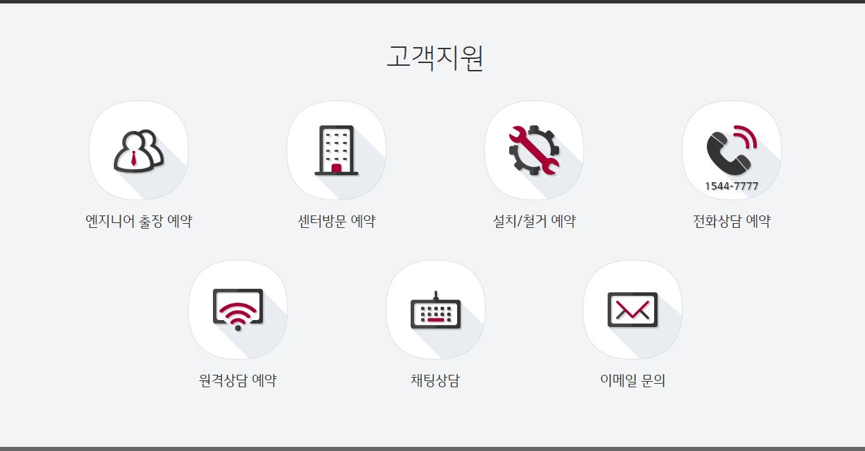 때문에 고객지원에서 엔지니어 출장 예약을 많이 하시구요. 아니면 문제가 있는 사항을 문의하기 위하여 휘센 에어컨 고객센터 전화번호인 '1544 7777'에 연락을 합니다. 전화상담 같은 경우는 연결이 되지 않을 경우가 있어서 미리 예약을 하시는게 더 편하구요.