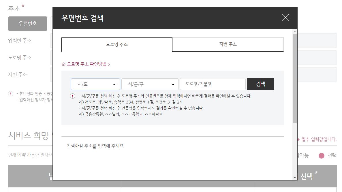그리고 주소를 기입하여 휘센 에어컨 서비스센터 서비스 희망 날짜를 선택하실 수 있는데요. 해당 지역의 엔지니어의 스케쥴에 따라서 예약이 가능한 일자와 날짜를 잘 선택하시기 바랍니다.