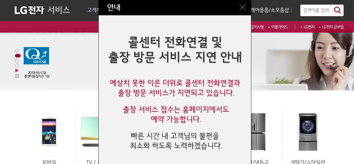 현재도 이른 더위가 찾아와 LG전자 서비스 홈페이지 (www.lgservice.co.kr)에 들어가면 콜센터의 전화연결 및 출장 방문 서비스가 지연되고 있다고 하는데요. 때문에 지연되더라도 하루라도 빨리 예약 신청을 해두시는 것을 추천드립니다.