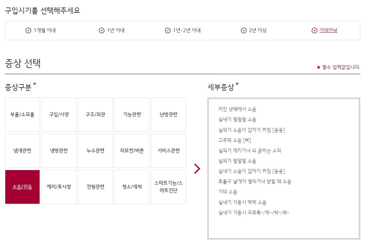 출장 예약 같은 경우는 제품 선택에서 엘지 휘센 에어컨의 모델명을 아셔야 합니다. 모델명까지 넣어주신 후에는 구매시기와 증상을 선택하셔야 해요. 세부적인 증상을 알려줘야 나중에 A/S를 하시는 분들도 더 편리할 것 같네요.