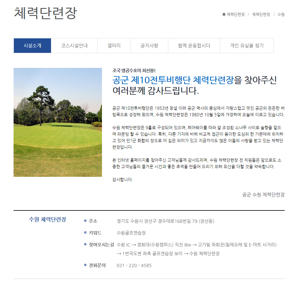9홀로 이뤄진 수원체력단련장은 권선구에 위치해 있다고 하는데요. 자세한 내용은 수원 공군체력단련장 홈페이지를 통하여 확인을 하시면 좋을 것 같습니다.