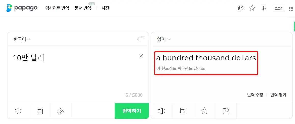 그럼 발음으로 어떻게 말할 수 있을까요? 파파고로 검색을 해보니 '어 헌드러드 싸우전드 달러즈'로 나왔습니다. 아무래도 앞에 '원(one)'이 아닌 '어(a)'가 들어갈 수도 있을 것 같네요.