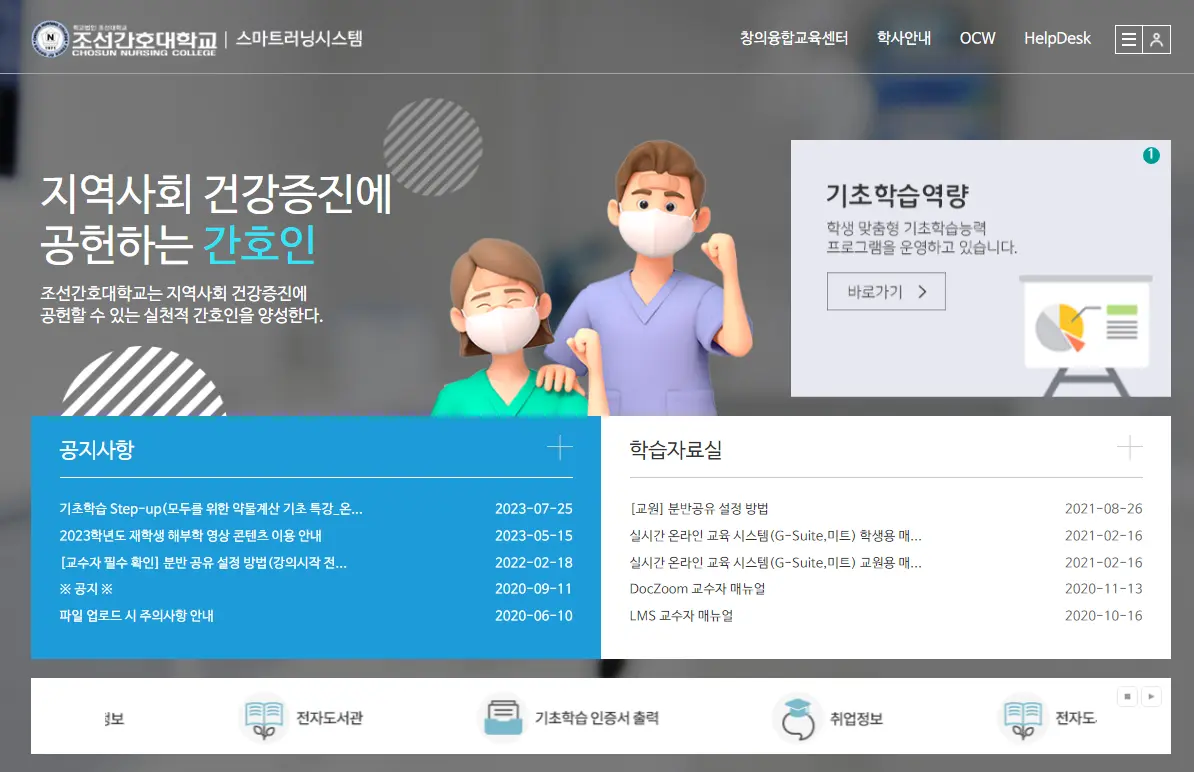 광주에 있는 조선간호대학교에서는 이러닝 제공을 위하여 조선간호대학교 스마트러닝시스템을 운영하고 있습니다. 학생 맞춤형 기초학습능력 프로그램과 같은 콘텐츠가 제공되어지니 확인해보시기 바랍니다.