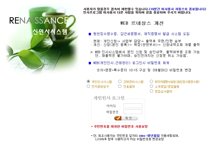 르네상스에서는 개인인사시스템, 근태관리시스템, 개인인사시스템 등이 제공됩니다. 또한 전표결제, 전자증빙청구, 퇴직자증명서요청도 할 수 있으니 급여, 인사, 복리후생 등의 전반적인 서비스가 이뤄지는 것 같습니다.
