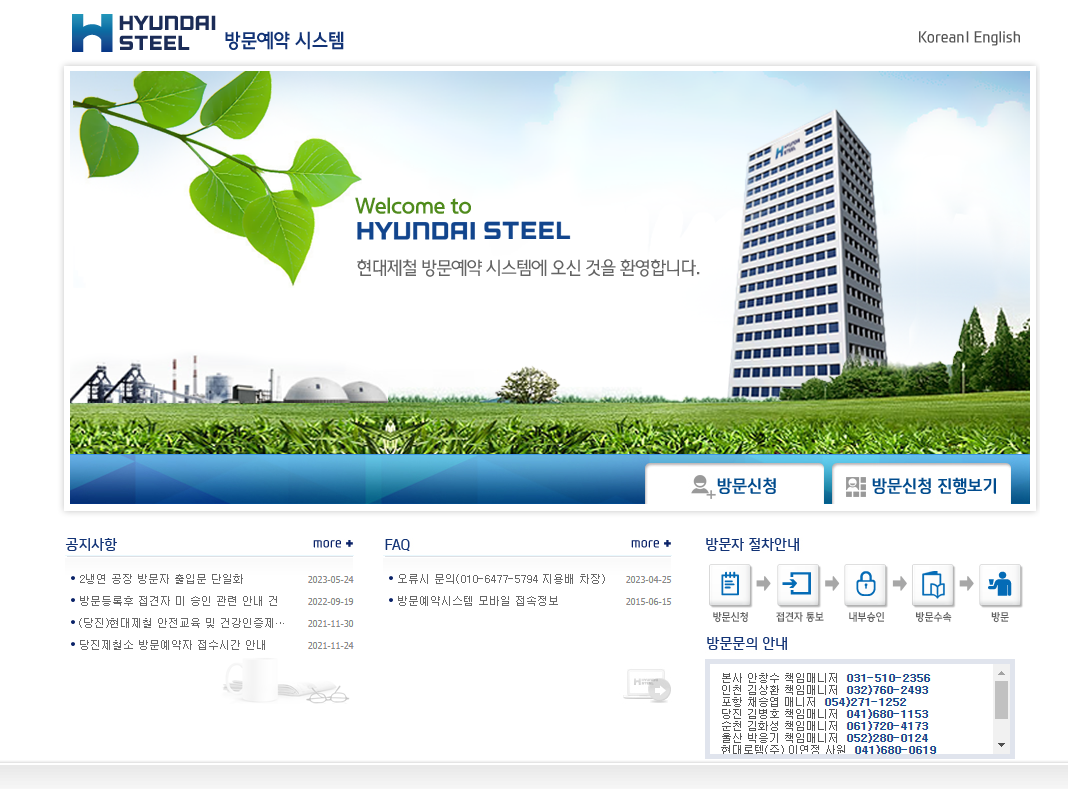 현대제철에서는 사업장을 방문하고자 하는 외부인들을 대상으로 온라인으로 방문신청을 예약할 수 있는 시스템을 제공합니다. 보안을 위하여 현대제철 방문예약 시스템 운영이 되고 있으니 방문을 하실 때에는 미리 예약진행을 하시고 허가를 받으시기 바랍니다.