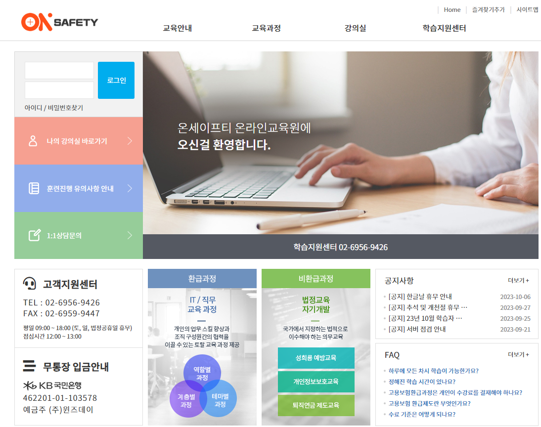 내일배움카드를 통한 직무 교육과정과 법정교육을 이수할 수 있는 온세이프티 온라인교육원입니다. 이곳에서는 다양한 교육과정과 훈련징행 유의사항을 확인하실 수 있으며, 학습지원센터의 이용도 가능합니다.