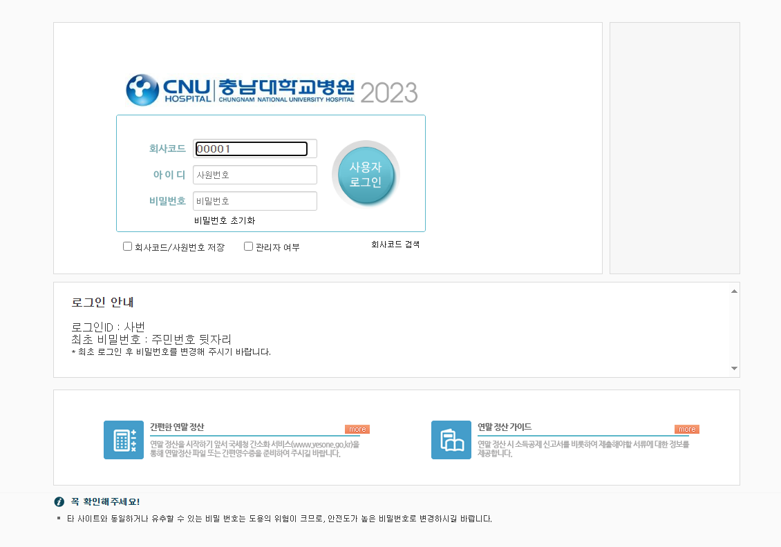 로그인은 사번과 최초비밀번호를 주민번호 뒷자리이니 참고하시고 안전하게 충남대학교병원 yeta 이용하셔서 연말정산 마치세요.