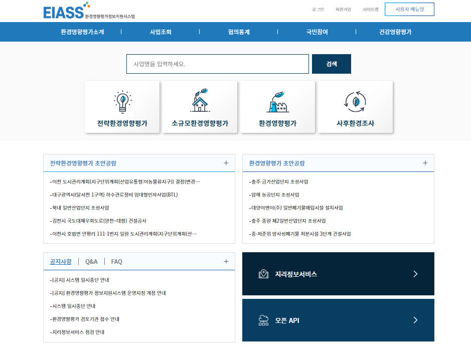 환경부에서는 환경영향평가 대상사업에 대한 정보를 제공하고 평가하기 위한 정보지원시스템을 지원합니다. 이러한 환경영향평가 정보지원시스템인 EIASS시스템에서는 사업정보 조회와 함께 전략적평가, 소규모평가, 사후환경조사 등을 확인하실 수 있습니다.