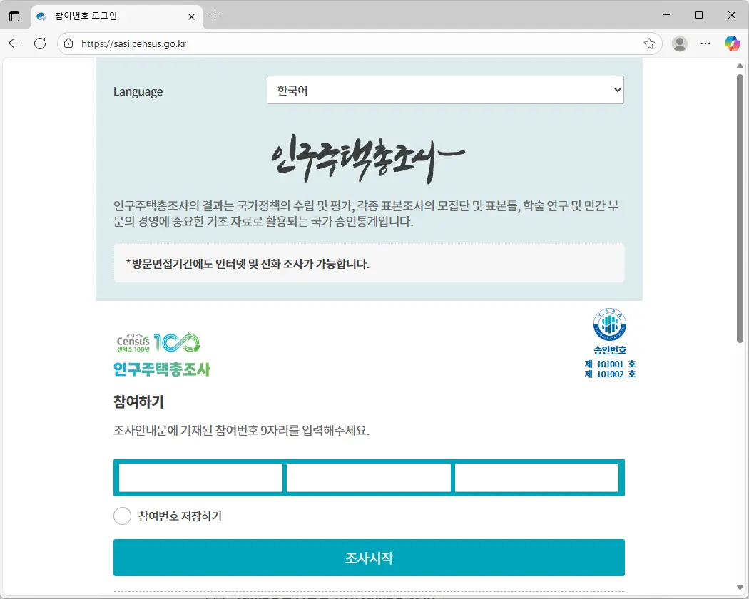 - 또는 통계청에서 발송한 안내 문자의 링크를 클릭하여 접속할 수도 있습니다.