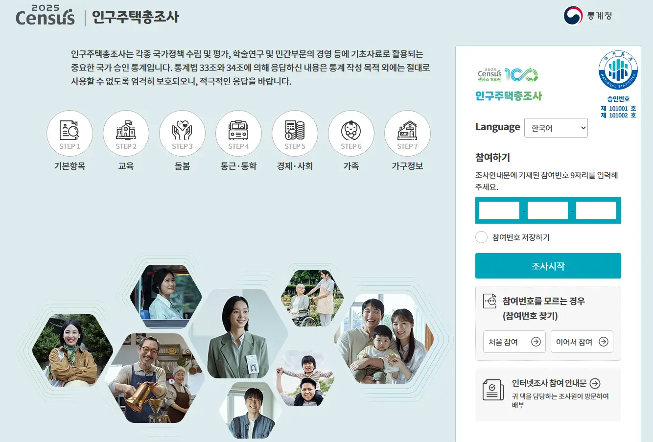 당신의 이야기가 대한민국의 내일을 만듭니다. 잠시 시간을 내어 2025 인구주택총조사에 참여하고 더 나은 대한민국을 만드는 데 동참해주세요.